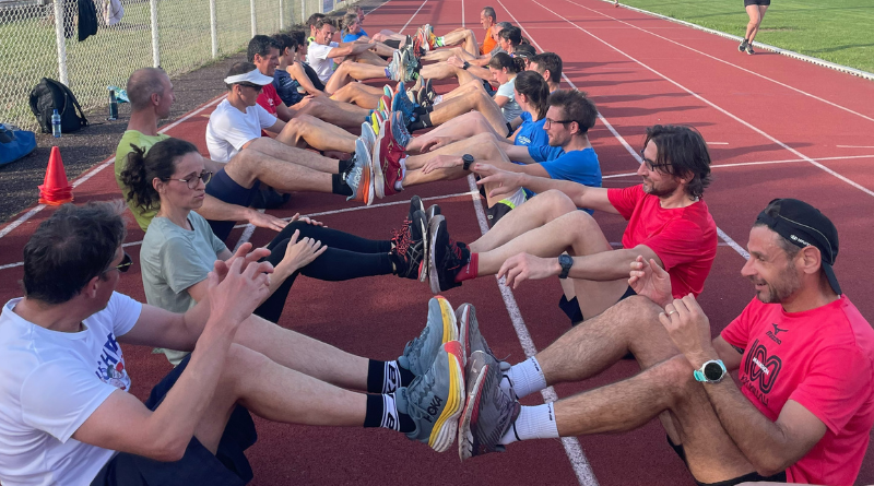 Avec plaisir, alors comme tous les mardis soirs, on débute par un échauffement au bord de la piste, on enchaine avec 1/4 d’heure de préparation générale avec des montées de genoux, talons fesses. Ce soir, c’est une pyramide avec 200m/400m/600m/800m et on redescend sur 600m/400m//200m. l’objectif était de prendre le chrono du 800m pour comparer avec un chrono déjà prit il y a quelques semaines et pour voir la progression éventuelle de nos athlètes. Ensuite, on termine toujours par étirements ou de gainages abdos, ce soir c’était plutôt gainage avec un petit défi qu’on s’est fixé depuis le stage de Rosas tous les mardis de monter de 15″ donc là on est sur 2’45 à l’heure actuelle pour préparer le stage de l’année prochaine. En plus une petit moment de convivialité dû à la naissance d’un bébé au club, donc il finisse l’apéritif.