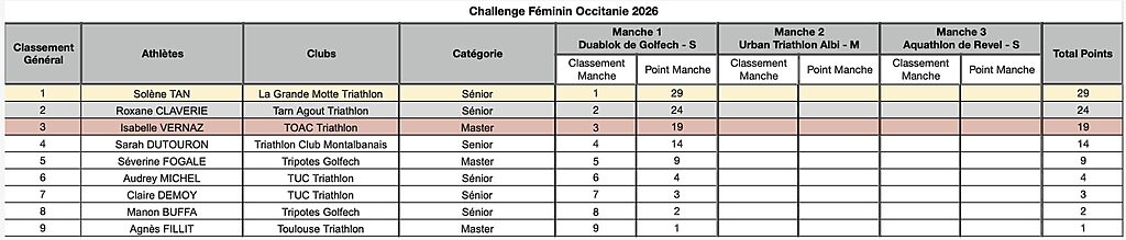 Le Challenge Féminin Occitanie est ouvert à l’ensemble des athlètes féminines licenciées dans un club de la Ligue Occitanie de Triathlon des catégories Séniores et Masters. Un classement individuel (Sénior et Master) sera établi. L’inscription est automatique. Seront considérées inscrites au Challenge Féminin de la Ligue Occitanie, les féminines ayant participé à minima à 2 des 3 épreuves régionales du Challenge 2026.